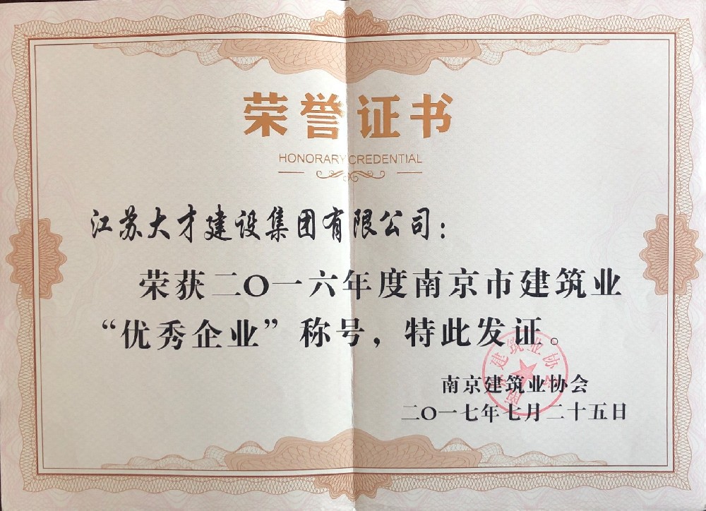 祝贺江苏大才建设集团有限公司:荣获2015年度南京市建筑业“优秀企业”称号,荣誉称号的获得对于集团未来的发展起到助推器的作用,集团上下干部职工将以此为契机,团结拼搏,科学管理,文明施工,争取更大的进步。