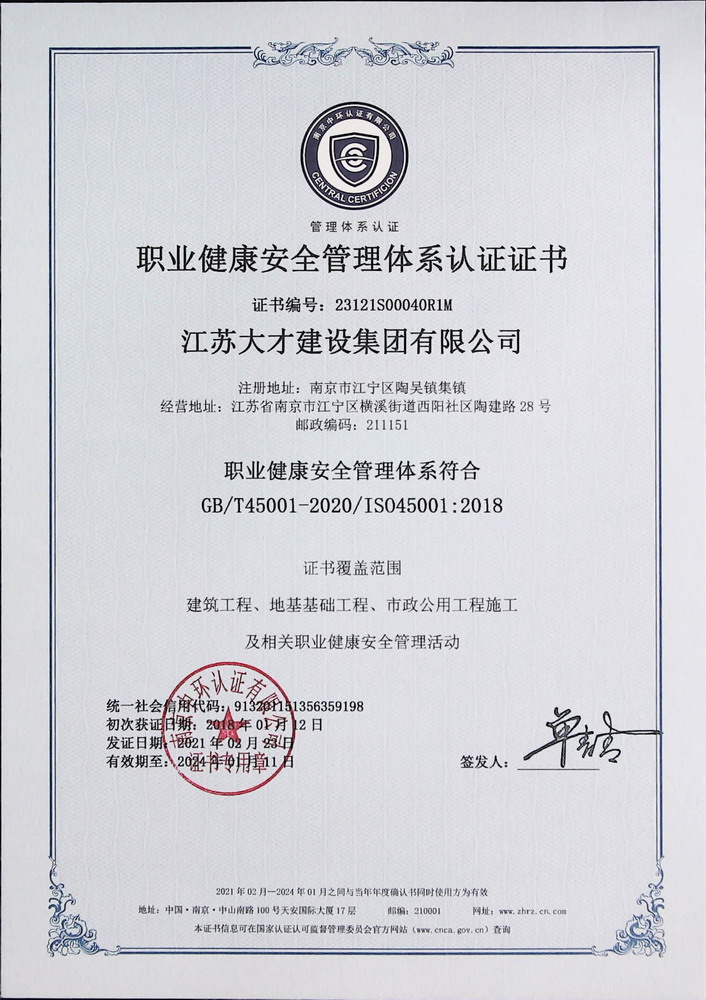 职业健康安全管理体系认证证书