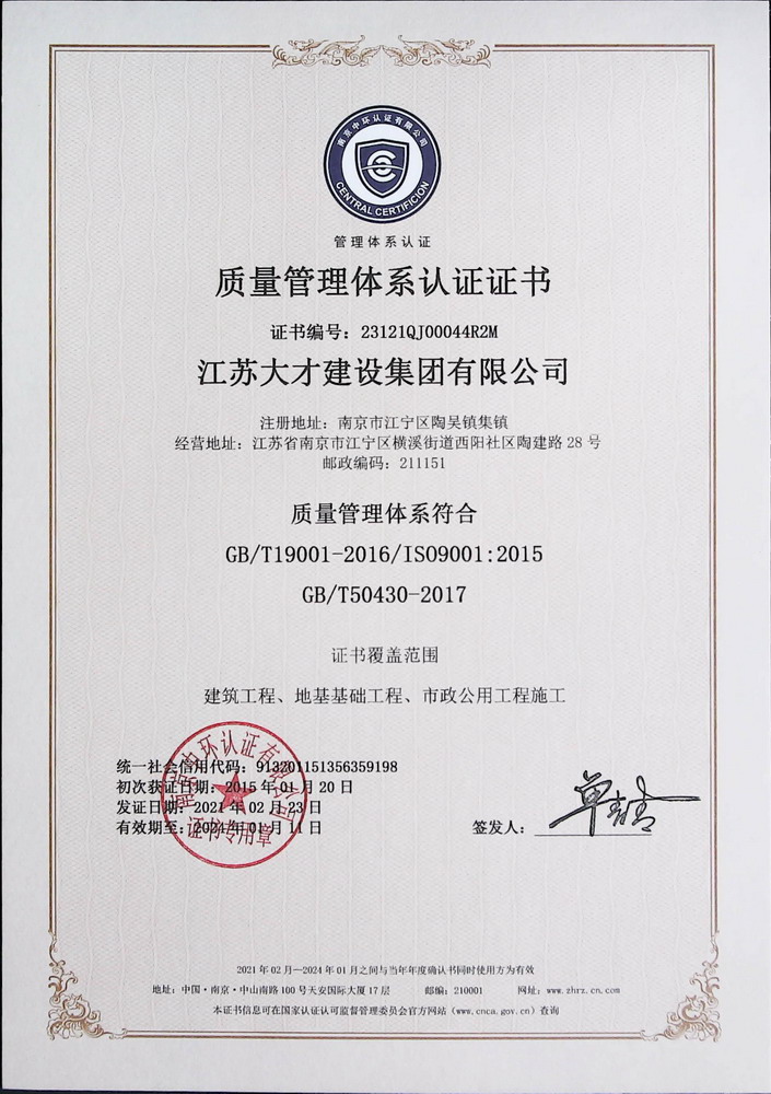 质量管理体系认证证书
